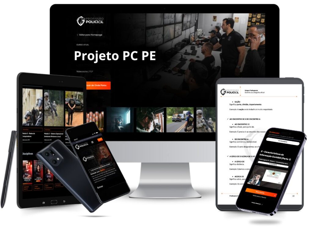 Esteja pronto para um próximo edital através de um curso completo e especializado na Polícia com videoaulas, PDFs e questões. Vamos te guiar do início da sua jornada até a sua aprovação no Concurso PC PE!